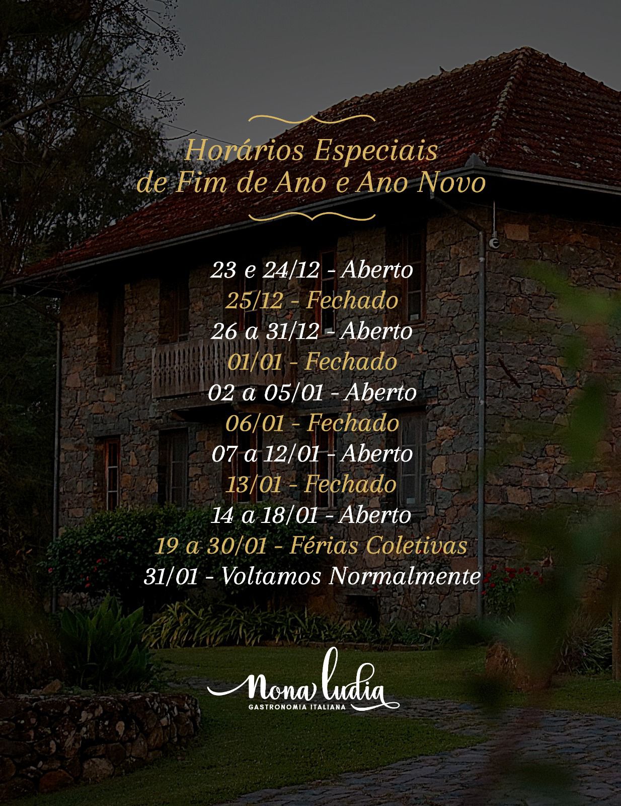 Aromas, sabores e muita história é o que se encontra aqui, no Nona Ludia Gastronomia Italiana. Um belíssimo lugar onde se pode conhecer a trajetória dos imigrantes, saborear pratos típicos e viver grandes momentos, num pedacinho do Vêneto na Serra Gaúcha.
